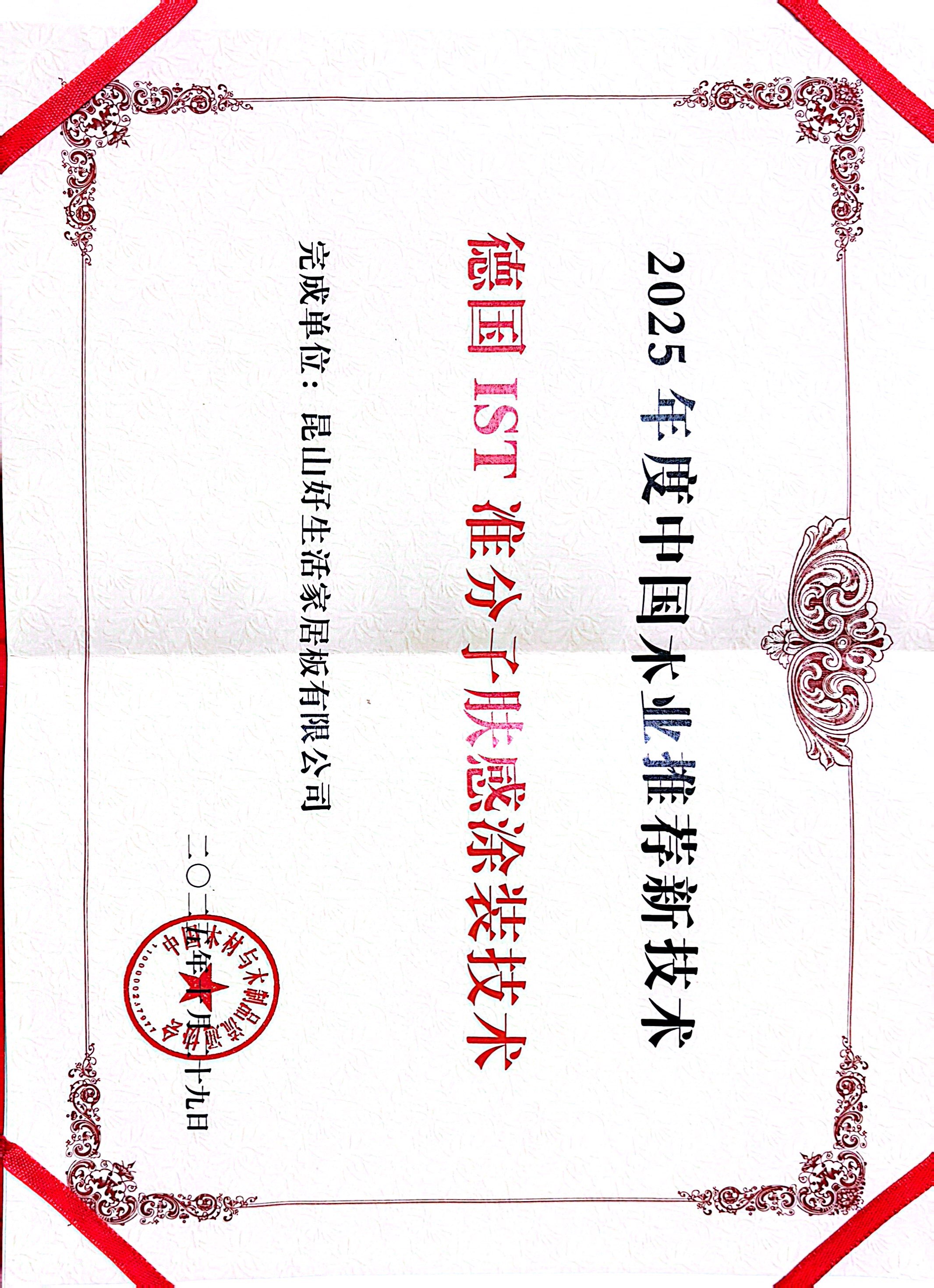 “德國IST準(zhǔn)分子膚感涂裝技術(shù)”獲評“2025年度中國木業(yè)推薦新技術(shù)”:該技術(shù)由公司自主研發(fā)并成功應(yīng)用,實(shí)現(xiàn)了表面質(zhì)感與環(huán)保性能的雙重突破,以科技定義行業(yè)新標(biāo)準(zhǔn)。