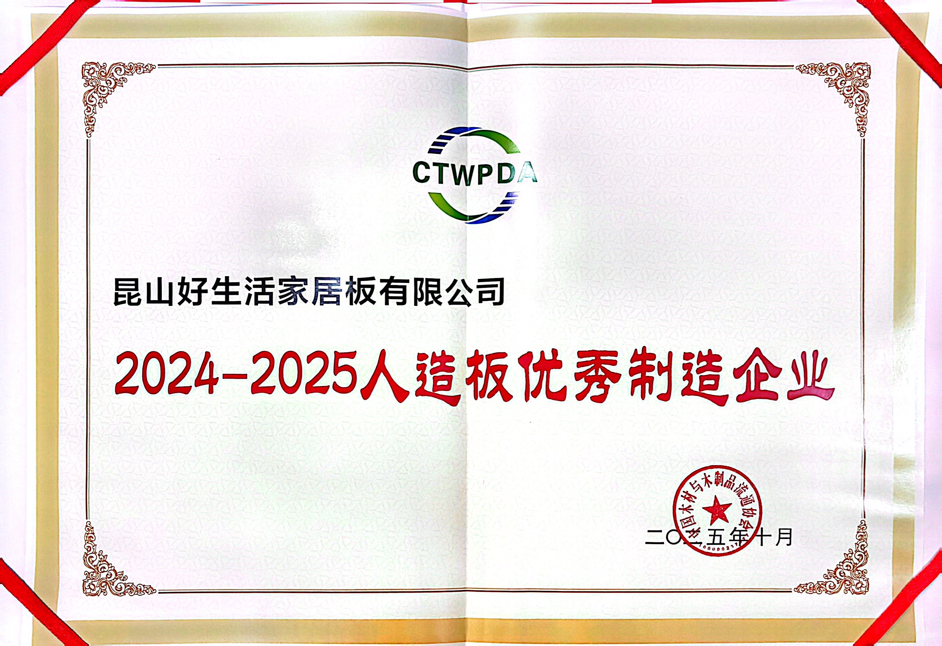 在此次行業(yè)盛會上,昆山好生活憑借卓越的制造實(shí)力與前沿的技術(shù)創(chuàng)新,斬獲三項(xiàng)重量級榮譽(yù):榮膺“2024-2025人造板優(yōu)秀制造企業(yè)”,這是對公司在高端浸漬膠膜紙飾面家居板領(lǐng)域先進(jìn)生產(chǎn)管理、穩(wěn)定品質(zhì)輸出和智能制造水平的高度認(rèn)可。